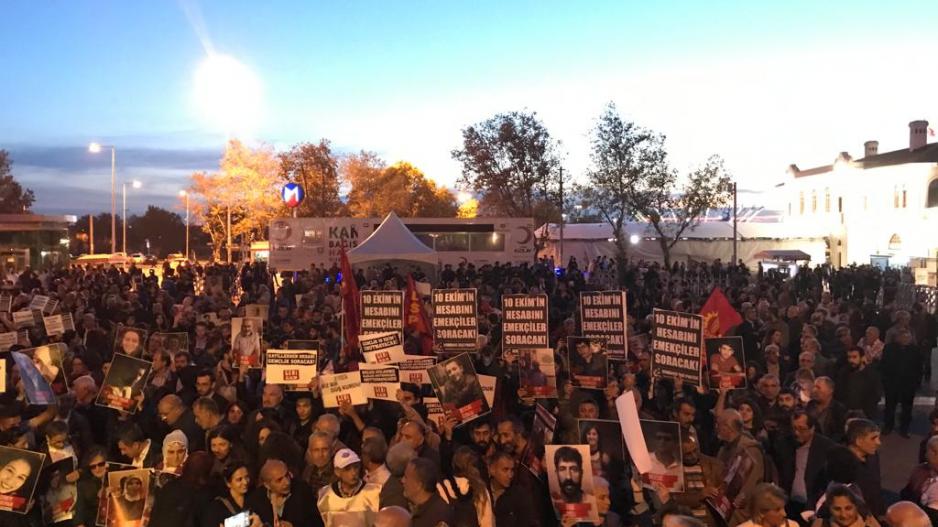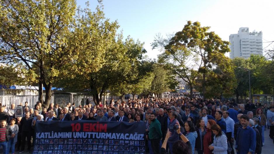KESK, DİSK, TOMMB ve TTB’nin düzenleyicisi olduğu eylem, saat 09:00’da Ulus Metro durağı çıkışında toplanan kitlenin tren garına yürüyüşüyle başladı. Katılımın oldukça yoğun olduğu yürüyüş esnasında kitle sık sık “Katil devlet hesap verecek!”, “10 Ekim’i unutma, unutturma!”, “Yaşasın hakların kardeşliği” sloganlarını attı. Yürüyüş esnasında Türkiye'nin Suriye’de başlattığı savaşa ilişkin sloganlar atılmışsa da dört yıl önce hiçbir güvenlik önlemi almayan polis, bu sloganlara karşı anında harekete geçip provokasyon yaratmaya çalıştı. Ancak kitle polisin saldırısına izin vermeyip eylemine devam etti.
