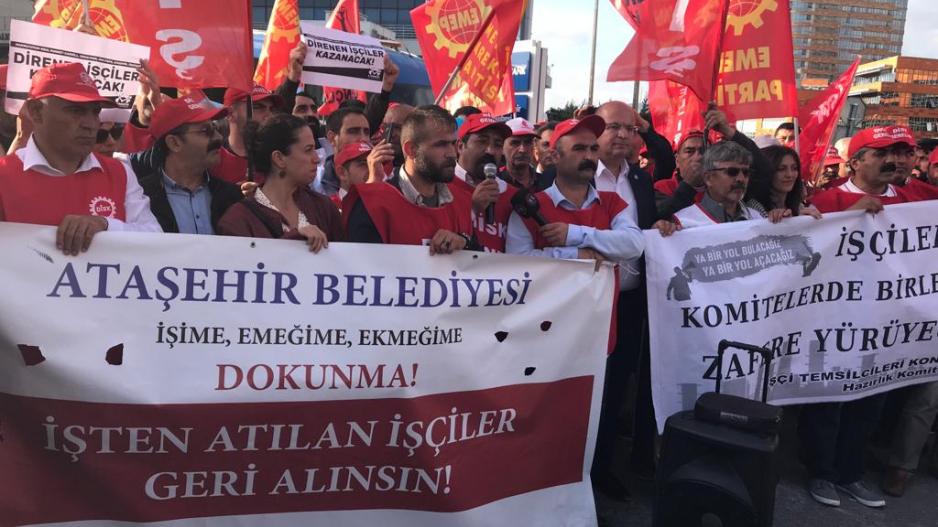 CHP'li Ataşehir Belediyesi 18 gün önce, belediyenin toplu iş sözleşmesini tanımamasına ve ücretlerin geciktirilmesine karşı mücadele eden ve sendikal faaliyet yürüten iki işçiyi işten çıkarmıştı. İşçiler 17 gündür belediye önünde işlerine geri dönebilmek için mücadele ediyor. İşçilerin üyesi olduğu DİSK'e bağlı Genel-İş sendikası bugün "hukuksuzca işten atılan işçilerin işlerine geri dönmesi" talebiyle bir basın açıklaması gerçekleştirdi.