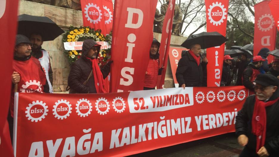 DİSK’in 52. kuruluş yıldönümü, DİSK’in çağrısıyla bugün saat 14.00’te işçiler, sendika ve siyasi parti temsilcilerinden oluşan yüzlerce kişinin katılımıyla kötü hava koşullarına rağmen Saraçhane Parkı'nda kutlandı.