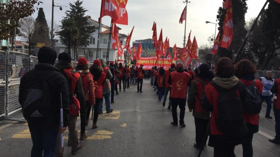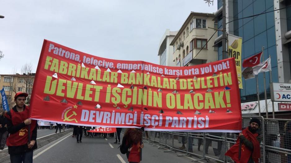 Devrimci İşçi Partisi de açlık ücretlerine, yoksulluğa, güvencesizliğe, işten atmalara, kıdem tazminatı başta olmak üzere işçilerin kazanılmış haklarının gaspına hayır demek için işçiler ve emekçilerle birlikte ekonomik krize karşı mitingde yerini aldı. Özgürlük Meydanı’na coşkulu bir kortejle yürüyen DİP, işçi emekçi ücretlerinin enflasyona karşı korunmasını ve aylık enflasyon oranında her ay zam yapılmasını talep etti. “Krizin faturasını patronlara ödetmek için birleşik işçi cephesi” ve “Patrona, tefeciye, emperyaliste karşı orta yol yok! Fabrikalar bankalar devletin devlet işçinin olacak!” sloganlarının yer aldığı pankartlarla yürüyen DİP korteji, miting alanında işçi sınıfının taleplerini yükseltti. Kortej yürüyüşte sık sık “Krizi yaratan bedelini ödesin!”, “Asgari değil insani ücret!”, “Kahrolsun istibdad yaşasın hürriyet!”, “İşçilerin birliği sermayeyi yenecek!”, “İşgal grev direniş, yaşasın sınıf mücadelemiz!” sloganlarını attı. Hiçbir ayrım gütmeden işçi sınıfının tamamına saldıran sermaye sınıfına, örgütlenerek, birleşerek cevap vereceğiz diyen DİP “Birleşik İşçi cephesini kuralım!” çağrısını mitinge katılan işçi ve emekçilerin arasında haykırdı. Yaklaşan yerel seçimlerde boykot kararını açıklayan DİP, mitingde de çözümün değil, sorunun parçası olan düzen muhalefetinden kopma, seçimleri boykot etme ve birleşik işçi cephesi için mücadele etme çağrısını yaygınlaştırdı.