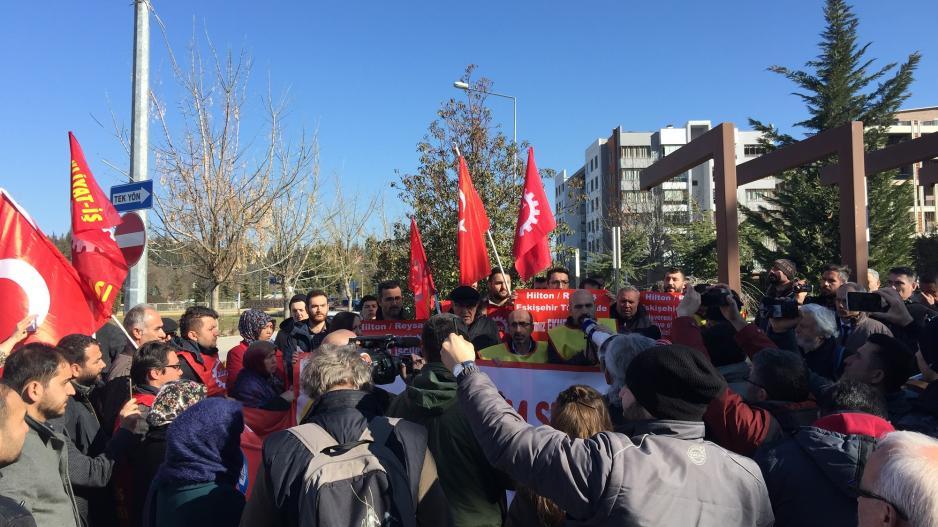 Eskişehir TÜVTÜRK Reysaş Araç Muayene İstasyonu’nda, sendikalaştıkları için işten atılan işçilerle dayanışma adına Eğitim-Sen, 4 Şubat Pazartesi saat 11.00’de yapılmak üzere basın açıklaması çağrısında bulunmuştu. Açıklama Reysaş patronunun sahibi olduğu Hilton Garden Otel’in önünde gerçekleştirilecekti. Fakat yapılacak basın açıklamasına saatler öncesinden TOMA’sıyla, gözaltı araçlarıyla, çevik kuvvetiyle gelen emniyet güçleri; otel patronunun valiliğe verdiği dilekçeyi dayanak göstererek Hilton Otel’in bulunduğu sokakta basın açıklamasına izin vermeyeceklerini belirttiler. Eskişehir Eğitim-Sen Şube Başkanı Faik Altan, Nakliyat-İş Sendikası Genel Başkanı Ali Rıza Küçükosmanoğlu ve işçilerin, basın açıklamalarını belirttikleri yerde yapacaklarını söylemeleri üzerine kolluk kuvvetleri ve işçiler arasında tartışma çıktı.