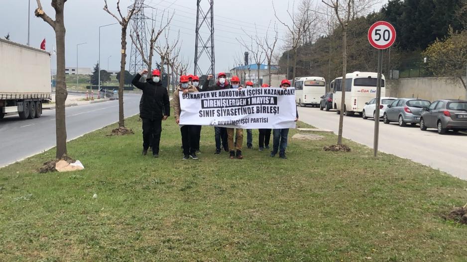 Devrimci İşçi Partisi olarak her iki mücadelenin de ilk gününden beri yanındayız. Ekmek ve hürriyetine sahip çıkan işçilerin haklı davasına destek oluyor ve herkesi bu haklı mücadelelere omuz vermeye çağırıyoruz. Bugün de DİP, 1 Mayıs’a giderken, her bir fabrikanın, işyerinin ama en çok da direniş alanlarının 1 Mayıs çağrısının yükseleceği mevziler olmasından hareketle, her iki fabrikada devam eden direniş alanlarındaydı. “Belkarper ve Adkoturk işçisi kazanacak! Direnişlerden 1Mayıs’a sınıf siyasetinde birleş!” pankartıyla ve sloganlarla direniş alanlarına yürüdü, direniş alanında işçilerle sohbet ettik. Adkoturk’te vardiya servisleri girerken alkışlarla, sloganlarla sendikasına sahip çıkan işçilerin sesine sesini kattı.