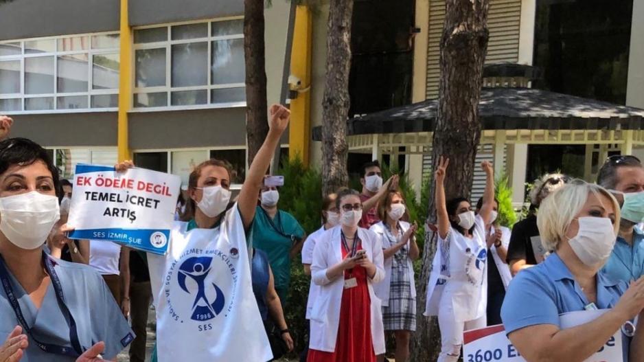 İzmir’de Dokuz Eylül Üniversitesi (DEÜ) Hastanesi’nde, pandemi sürecinde kurumun zarar ettiği gerekçe gösterilerek sağlık emekçilerinin ek ödemelerinde yüzde 20’den başlayan oranlarda kesinti yapılması üzerine emekçiler hastane bahçesini mücadele alanına çevirdi. 15 Haziran’da yapılan ilk açıklamanın ardından başlayan mücadele güçlenerek devam ediyor. Koronavirüs salgının başından beri sürecin hastane yönetimi tarafından şeffaf yönetilmemesi üzerine, sendikaların emekçilerin sorunlarını konu alan ortak bir görüşme talebinin yönetim tarafından reddedilmesi ve kazanılmış haklara da saldırılması bardağı taşıran son damla oldu.