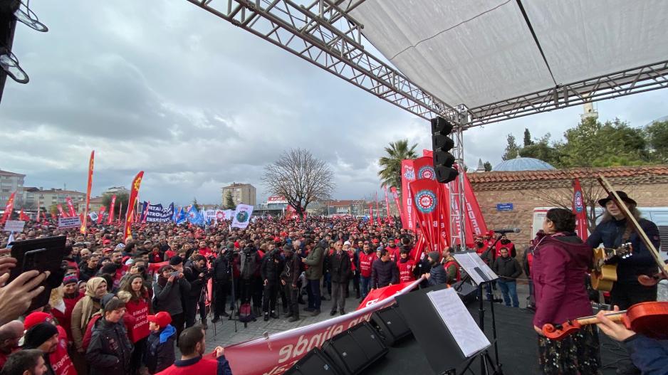 DİSK Birleşik Metal-İş Sendikası binlerce metal işçisinin katıldığı Gebze mitinginde MESS’in dayatmalarına karşı 5 Şubat’ta greve çıkma kararı aldığını açıkladı. Gebze Trafo Meydanı’nda iki kolda toplanan metal işçileri buradan Gebze Kent Meydanı’na coşkulu sloganlar eşliğinde yürüdü. Özellikle MESS kapsamındaki fabrikaların yoğunlukla yer aldığı Gebze ve Bursa şubelerinin yer aldığı yürüyüş kolu sık sık “işgal, grev, direniş” sloganlarıyla sokakları çınlattı. “MESS’i ezeceğiz” ve “işgal, grev, direniş” pankartlarıyla Metal İşçisinin Sesi korteji de bu koldan yürüyerek mitinge katıldı. Mitingde ayrıca Türk-İş’e bağlı Petrol-İş’te örgütlü olan grevdeki Trelleborg işçileri kalabalık bir kortejle yer alırken yine Türk-İş’e bağlı taşımacılık işkolu sendikası Tümtis ve gıda işkolu sendikası Tek Gıda-İş de sınıf dayanışmasının güzel bir örneğini sergileyerek mitinge katıldılar.