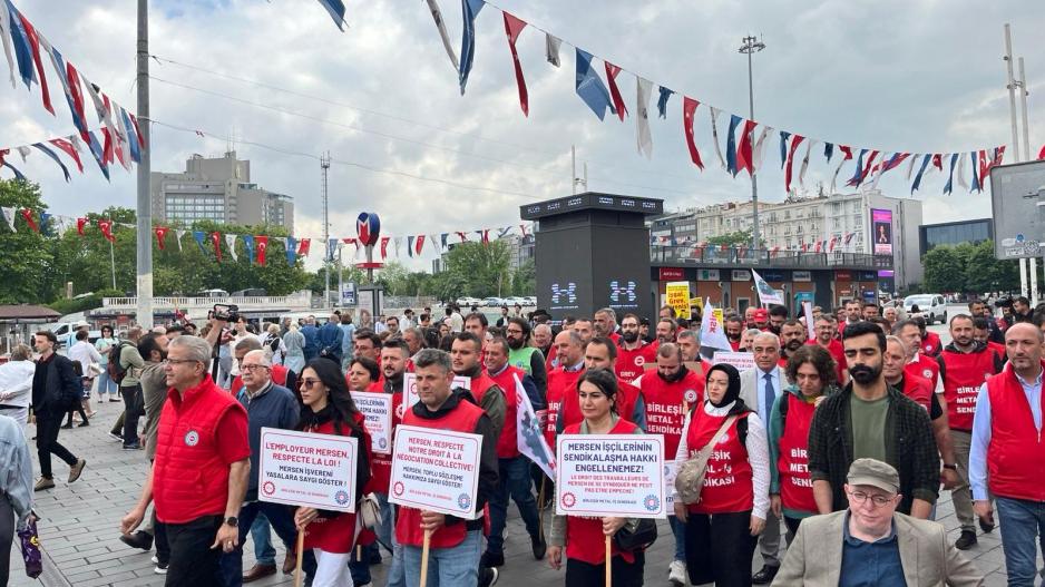 Mersen işçileri grevlerinin 40. gününde Fransız sermayeli şirketin yaptığı sendikal baskıları, Çalışma Bakanlığı müfettişleri tarafından da tespit edilen üretimi sürdürmeye yönelik usulsüzlükleri, şirketin mahkeme ve yasa tanımaz sendika düşmanı tavrını protesto etmek için Taksim’de buluştu. Meydandan Fransa İstanbul Başkonsolosluğu önüne yürüyen işçiler hazırladıkları Fransızca ve Türkçe pankartlar ve sloganlarla Mersen yönetimini işçilerin sendika ve toplu sözleşme hakkına saygı duymaya çağırdı.