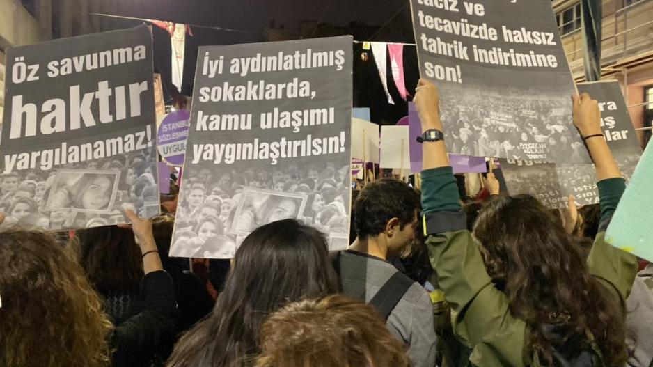 Devrimci İşçi Partili Kadınlar, eyleme “Erkek şiddetine karşı öz savunma örgütlenmeleri kuralım!”, “Öz savunma haktır yargılanamaz!”, “Kadına yönelik suçlara ağırlaştırılmış caydırıcı cezalar uygulansın!”, “Kadına karşı taciz ve tecavüzde haksız tahrik indirimine son!”, “İyi hal indirimi kaldırılsın!” ve “İyi aydınlatılmış sokaklarda, kamu ulaşımı yaygınlaştırılsın!” yazılı dövizlerle katılarak kadınların taleplerini yükseltti.