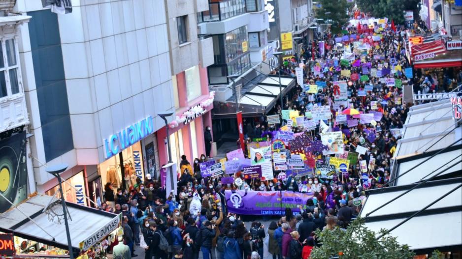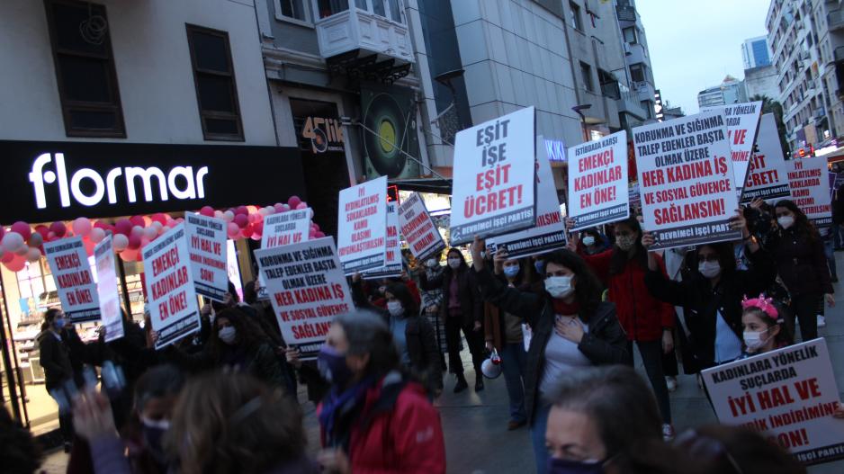 8 Mart Dünya Emekçi Kadınlar Günü’nde İzmir Alsancak’ta yüzlerce kadın İzmir Kadın Platformu çatısı altında sokakları doldurdu. “Güvenceli iş, şiddetsiz yaşam ve eşitlik için aşağı bakmıyoruz” pankartı arkasında toplanan kadınlara çevrede bulunan insanlardan, kafe çalışanlarından yoğun destek geldi. 18.30’da Alsancak Kıbrıs Şehitleri caddesinde buluşan kadınlar, polisin yoğun kalabalığı ve önlemi ile karşılaştı. Fakat bu önemli günde kadınların mücadelesinde alana taşıdığı öfke ve coşku karşısında bir engel kalmadı. Yürüyüşe siyasi partiler, sendikalar, dernekler ve çok sayıda kadın örgütü katıldı. Yürüyüş boyunca kadınlar, kadın cinayetlerinin politik olduğunu, İstanbul Sözleşmesi dâhil kazanılmış haklarından vazgeçmeyeceklerini, toplumun her alanında, çalışma yaşamında eşitlik taleplerini sloganlarla haykırdı.