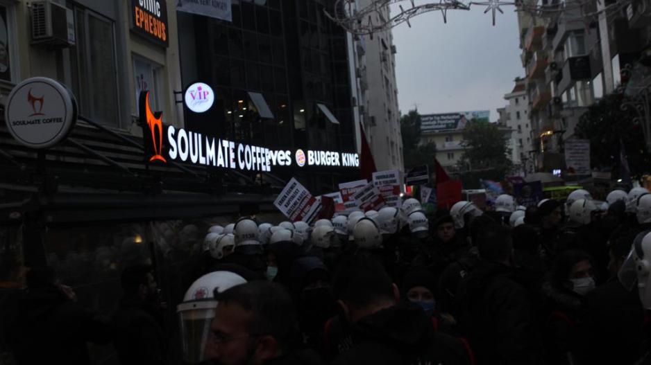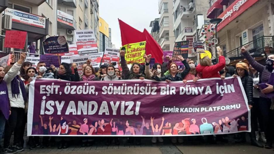 İzmir’de yüzlerce kadın 8 Mart Dünya Emekçi Kadınlar Günü’nde İzmir Kadın Platformu’nun çağrısıyla Alsancak Türkan Saylan Kültür Merkezi önünde bir araya geldi. “Eşit, özgür, sömürüsüz bir dünya için isyandayız” ortak pankartı arkasında buluşan kadınlar ÖSYM binasına doğru bir yürüyüş gerçekleştirmek istedi. 18:00’de başlaması planlanan yürüyüşü istibdadın diktiği polisler sözlü ve fiziki saldırıyla keyfi olarak engellemeye çalışsa da; kadınlar kararlı duruşlarıyla bir adım geri atmadı ve barikatı yaran kadınlar yürüyüşe geçti.