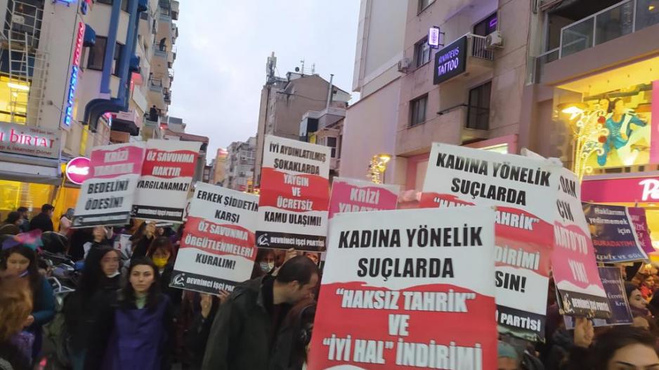 Çok sayıda siyasi parti, sendika, oda ve kadın örgütlerinden katılımla gerçekleşen yürüyüşe Devrimci İşçi Partili Kadınlar da katıldı. Devrimci İşçi Partilinden Kadınlar yürüyüşte “Emekçi kadınlar en öne!” şiarı ve “NATO’dan çık, NATO’yu yık!”, “Krizi yaratan bedelini ödesin!”, “Öz savunma haktır, yargılanamaz!” talepleriyle yer aldı. Yürüyüşün ardından basın açıklamasına geçildi. Açıklamada, krizin yükünü en çok çekenin kadınlar olduğu, en güvencesiz ve kötü şartlarda kadınların çalıştığı, ayrımcı ve şiddeti körükleyen politikalardan yine en çok kadınların etkilendiği vurgulandı. Kadınların gelen zamlar, yükselen faturalar ve sefalet ücretleriyle bir darboğazın içine çekildiği, işsizlikte ilk gözden çıkarılanların kadınlar olduğu, kadınların bu sebeple git gide daha fazla başkasına bağımlı hâle gelerek yaşamını sürdürdüğüne dikkat çekildi.