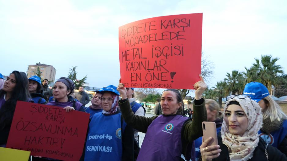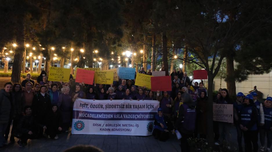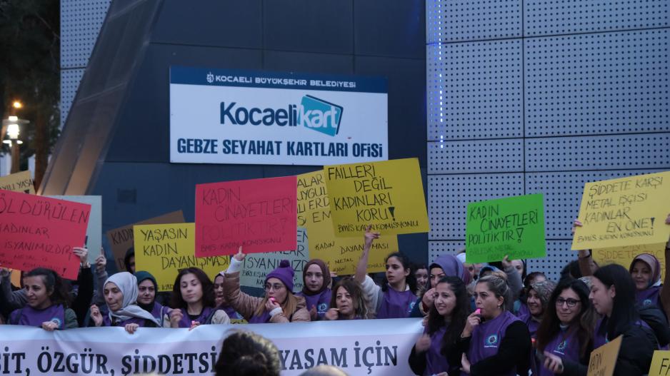 Kadınlar eylemde “Metal İşçisi kadınlar şiddete karşı mücadelede en öne!”, “Ceza indirimlerinin cinsiyetçi uygulamasına son!”, “Yasaları uygula katillerden hesap sor!”, “Şiddete karşı özsavunma haktır!” yazılı dövizler taşıdı.