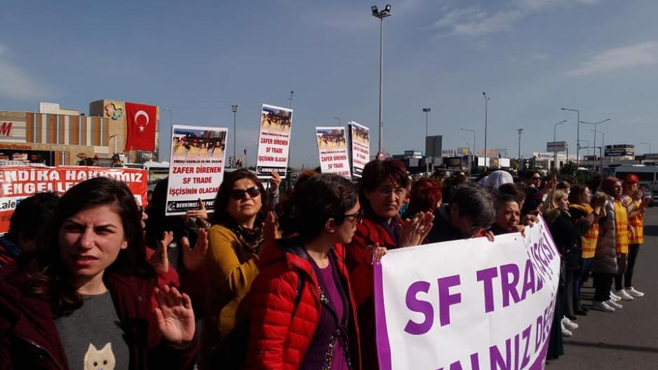 İzmir Kadın Platformu’nun çağrısı ile Gaziemir Serbest Bölge’de toplanan kadınlar, direniş alanına kadar “SF Trade işçisi yalnız değildir” yazılı pankart ile yürüdü. Yürüyüşe Devrimci İşçi Partili Kadınlar da “Emekçi kadınlar en öne çıkacak! Zafer direnen SF Trade işçisinin olacak” yazılı dövizlerle katıldı. Yürüyüş direniş alanında sona ererken direniş alanında yapılan etkinlikte, Viyan Kadın Korosu şarkılar söyledi. Konserin ardından kurulan serbest kürsüde konuşma yapan SF Trade işçisi bir kadın, mücadelelerine ilk günkü inançla devam ettiklerini ve kazanıncaya kadar mücadeleye devam edeceklerini dile getirdi. Serbest kürsüde konuşan diğer kadınlar, SF Trade işçilerinin 140 gündür devam eden direnişini selamlayarak; tüm emekçi kadınları yarın saat 16:00’da Alsancak Kıbrıs Şehitleri Caddesi’nde yapılacak yürüyüşe davet ettiler. Etkinlik alkış ve sloganlarla sona erdi.