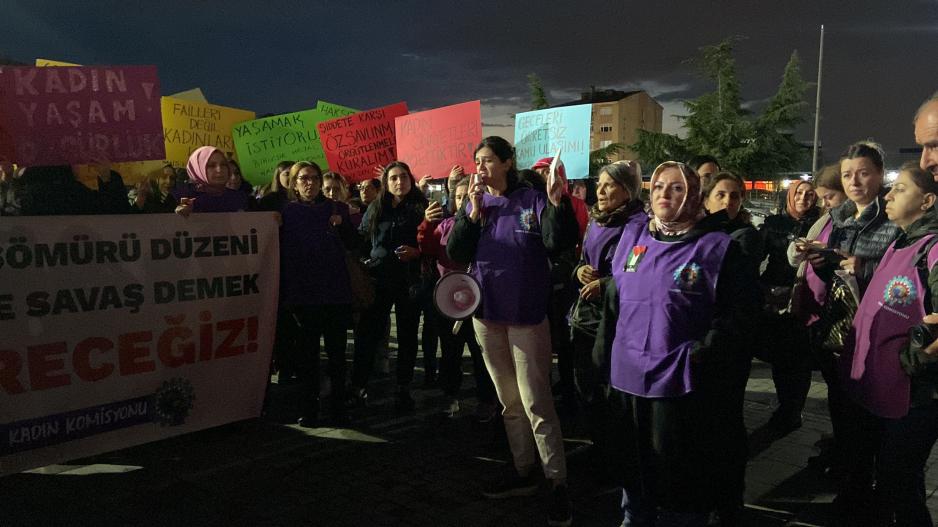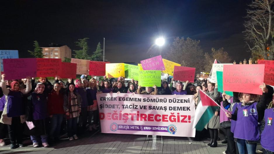Kadınlar “Erkek egemen sömürü düzeni şiddet, taciz, savaş demek; değiştireceğiz!” yazılı pankartın arkasında erkek egemen kapitalist düzene karşı mücadeleyi yükseltme çağrısı yaparak yürüyüşlerine başladı. Birleşik Metal İş Kadın Komisyonu adına eylemin açılışını yapan kadın işçi, kadın cinayetlerinin her geçen yıl arttığını, neredeyse her gün bir kadının katledildiğini ancak metal işçisi kadınların artık buna karşı susmadığını, sesini yükselttiğini söyleyerek başladı. Bu kadar çok öldürülmesinin, kadınların şiddetle, tacizle, tecavüzle karşı karşıya kalmasının sebebinin kadınları koruyacak yasaların uygulanmaması olduğunu vurguladı. Ayrıca kadın dayanışmasının sınır tanımadığını, metal işçisi kadınların Siyonist İsrail’in saldırısı altındaki Filistin halkının da yanında olduğunu söyledi.