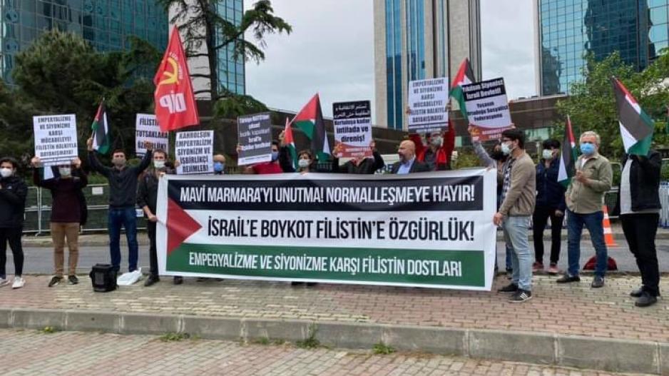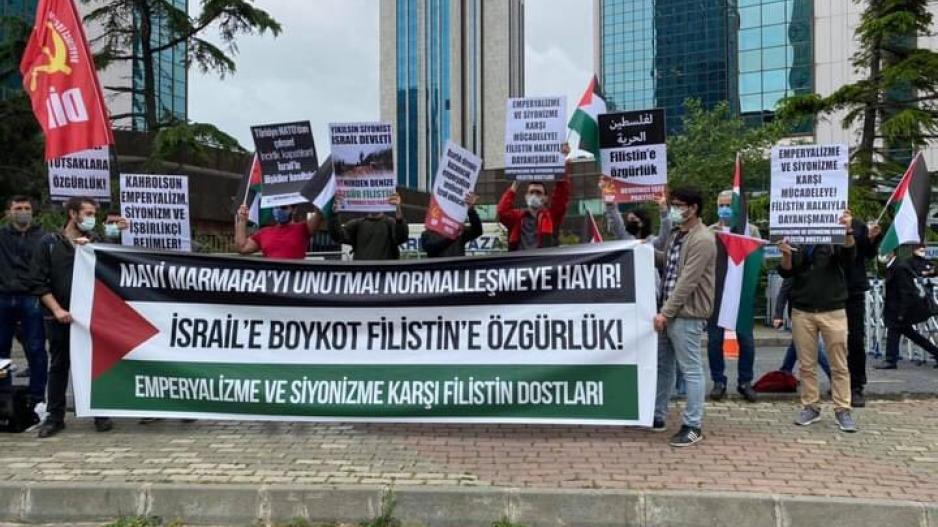 Emperyalizme ve Siyonizme Karşı Filistin Dostları, Mavi Marmara katliamının 11. yıldönümünde İsrail’in İstanbul’da bulunan konsolosluk binası önünde bir basın açıklaması gerçekleştirdi. Açıklama metnini okuyan Filistin Dostları sözcüsü, Mavi Marmara’nın, İsrail’in 1948’den bu yana gerçekleştirdiği katliamlar zincirinin bir halkası olduğunu vurguladı ve İsrail’in, yıkılmadıkça bunlara devam edecek bir terör devleti olduğunu belirtti. İsrail’in bu katliamları yapmaya cüret edebilmesinde emperyalizm ve bölgedeki gerici rejimler kadar, Filistin halkı ile sözde bir dostluk kurup, arka planda İsrail ile artan bir ticareti sürdüren, Filistin halkının boykot ve yaptırım taleplerini görmezden gelen Türkiye’deki istibdad rejiminin de payı olduğunu ifade etti. Türkiye’de Filistin halkının gerçek dostlarının Türkiye’nin emekçi halkı olduğunun altını çizdi.