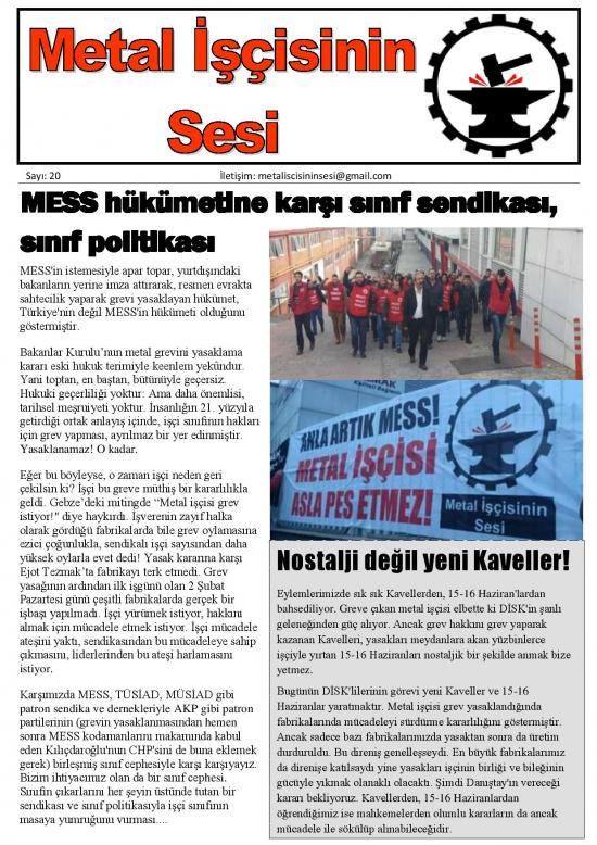 Metal İşçisinin Sesi Sayı 20 Metal İşçisinin Sesi bülteni sayı 20'yi buradan indirebilirsiniz. Metal İşçisinin Sesi'nin Facebook'tan da takip etmek için tıklayın.