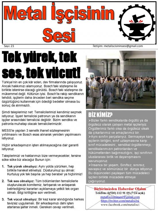 Metal İşçisinin Sesi Sayı 21 Metal İşçisinin Sesi bülteni sayı 21'i buradan indirebilirsiniz. Metal İşçisinin Sesi'nin Facebook'tan takip etmek için tıklayın.